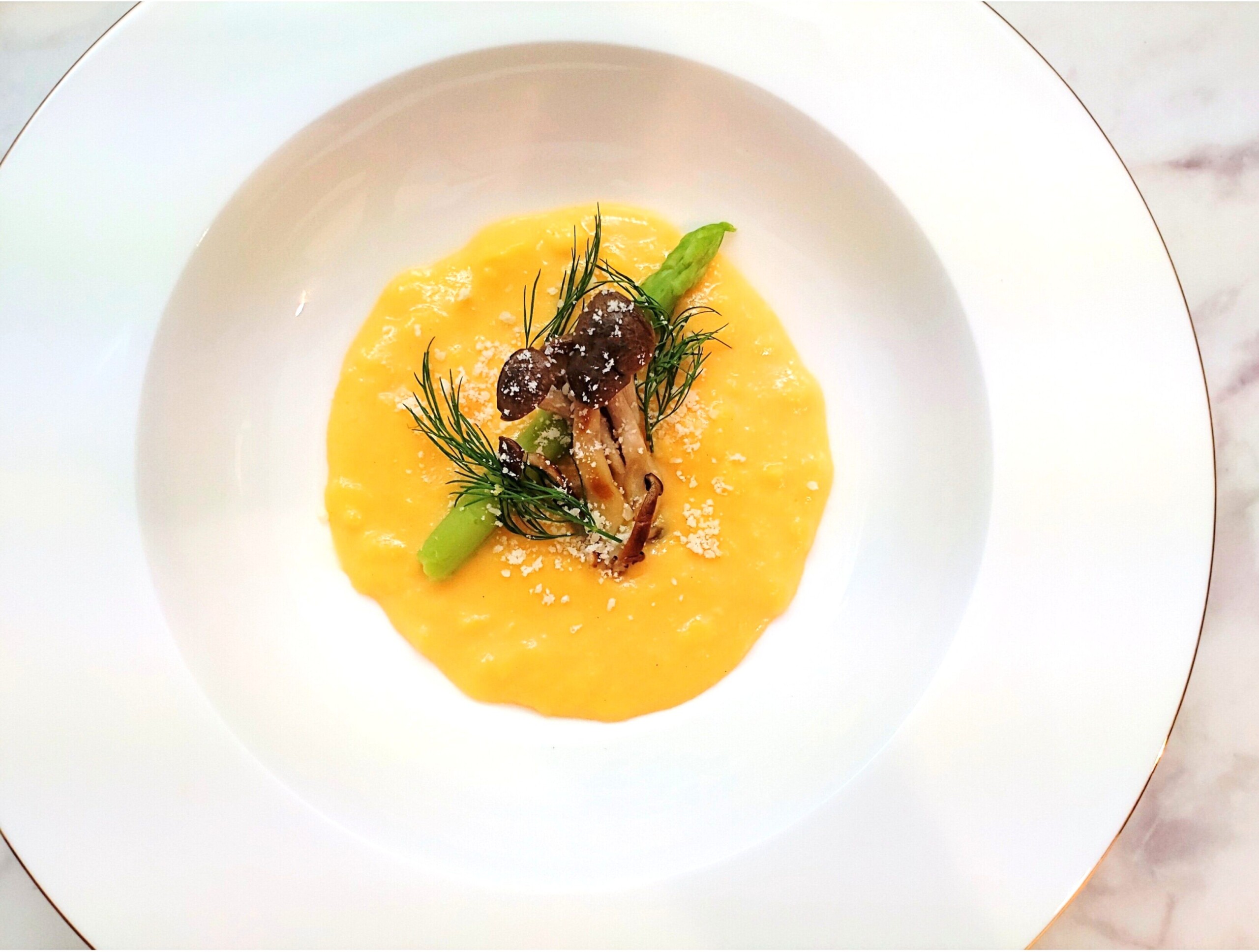 3.お皿の中央にウフ・ブルイエをスプーンで円形に盛り付け、アスパラガスを右に向かって斜めに1本上において、シメジを中央に盛り付けます。シメジの近くにディルを三か所飾り、パルメザンチーズを振りかけたら完成です。
